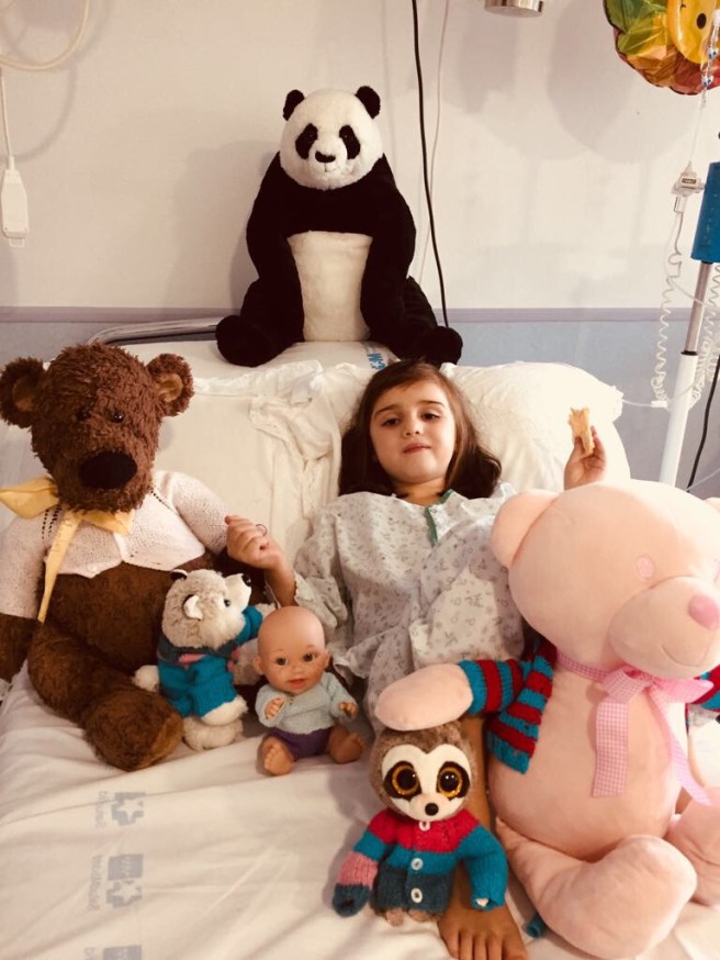 Hemos recibido un regalo genial, una tía abuela de Olí le ha hecho unos jerseys para sus muñecos, como en el hospital solo tenemos peluches les hemos vestido a todos con ellos dice que porque le ponemos a Sr Oso un jersey rosa si es un chico…