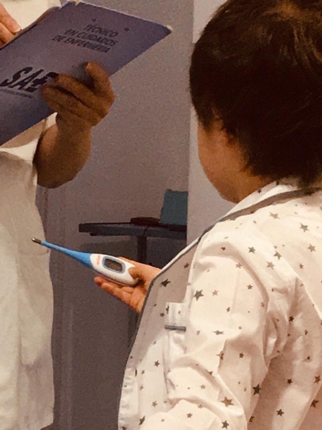 El porta ha seguido manchando un poquito y no deja que nadie se lo toque. Hemos sacado su maletín de enfermera y ella sola haciéndolo con muchísimo cuidado se lo ha limpiado y se ha cambiado su apósito. Estaba tan orgullosa de hacerlo tan bien y ser tan buena enfermera que no se ha quejado ni un poco. Todo ha sido un juego genial 😀 además de reírse mucho con la idea de que sus camisas eran de Halloween de verdad 😳