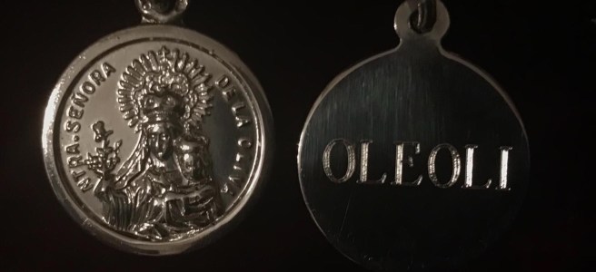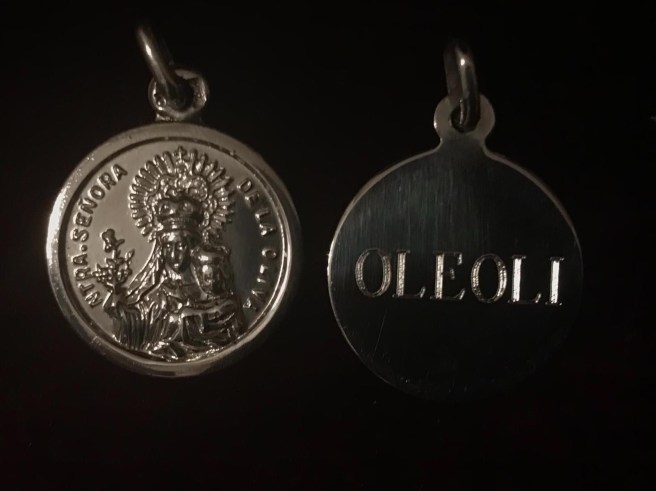 Su Madrina le ha hecho un regalo muy especial por su Santo, para darle más “caché” a las Oléolis que hacemos le ha comprado medallitas de plata con la Virgen de la Oliva y grabadas con OleOli por detrás!