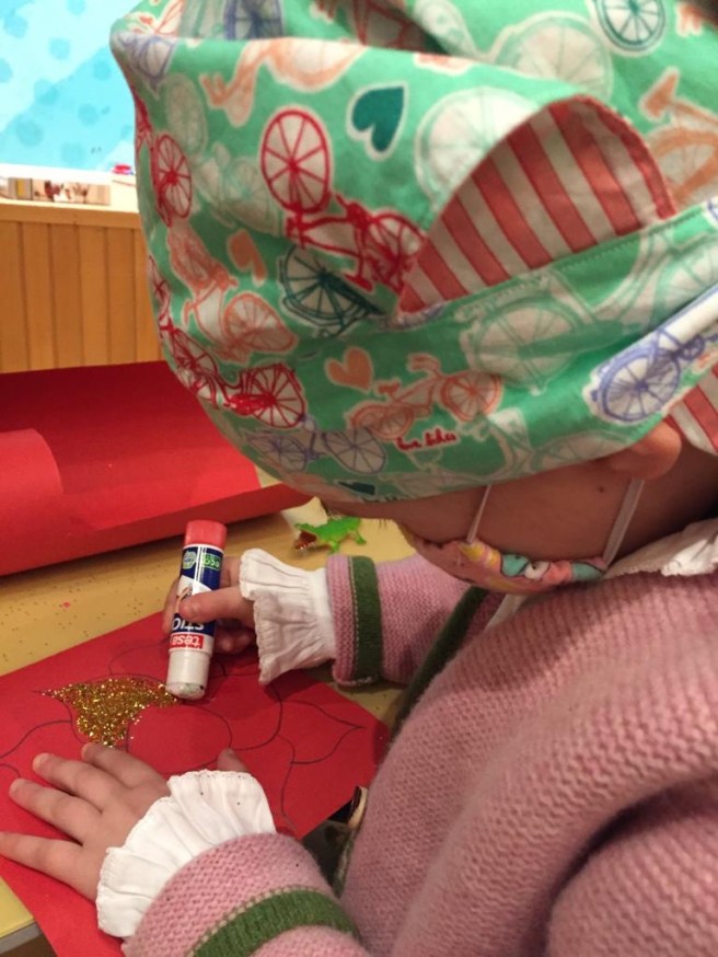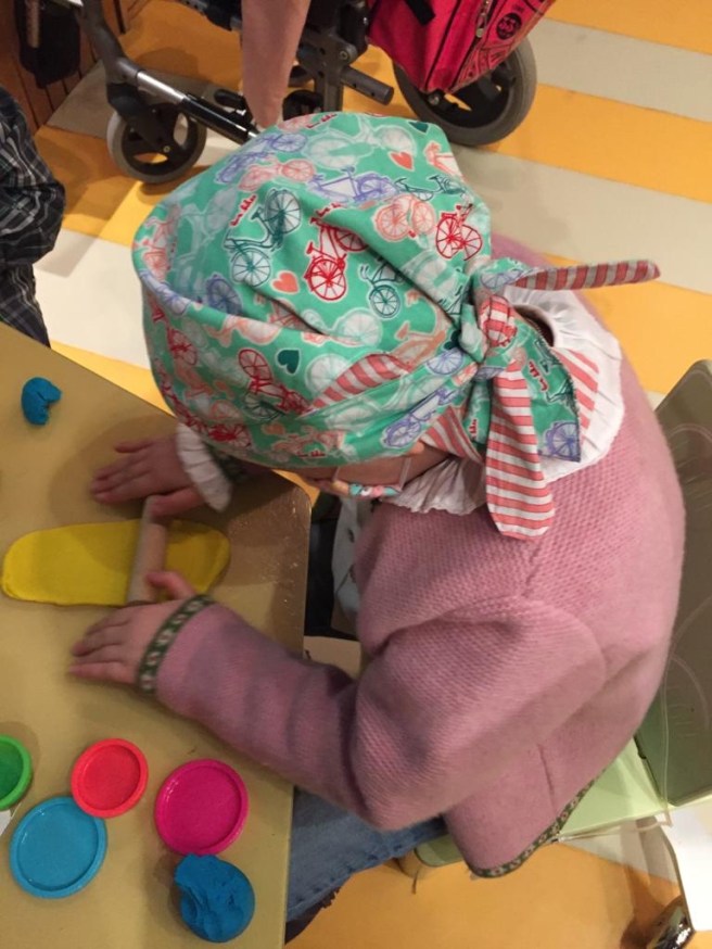 La espera de la analítica la hemos hecho hidratando por si sonaba la flauta y fuera del hospital de día. Primero hemos dado un paseo a San Ilde, que como el pasillo lo están arreglando no hemos podido ir en el super coche rojo. Ahí hemos visitado a nuestros enfermeros que adoramos y a alguna que otra amiga. Hemos estado también en el teatro con las mil cosas que hay para jugar: plasti, trabajos con purpurina, jugar a los restaurantes, cuentos, música… Lo hemos pasado genial con los voluntarios que cada día vienen al hospital a jugar y entretener estos días tan largos y a veces tan difíciles que se pasan. No nos cansaremos de darles las gracias nunca ❤