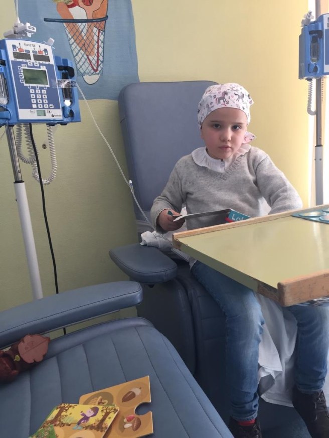 Ha habido un momento que estaba contándole a una enfermera lo poco que nos quedaba y Oli nos ha interrumpido. “Mamá, cuando se me limpie la sangre, ¿voy a poder seguir viniendo al hospital?”. Le he contestado “¿tú quieres?” y ella muy sonriente ha dicho “siiiiii”. Con esto me quedo hoy; estaba tumbada recibiendo su Quimio, pero a ella no le gustaría dejar de ir ahí! Enhorabuena a nuestro hospi y gracias!!!!